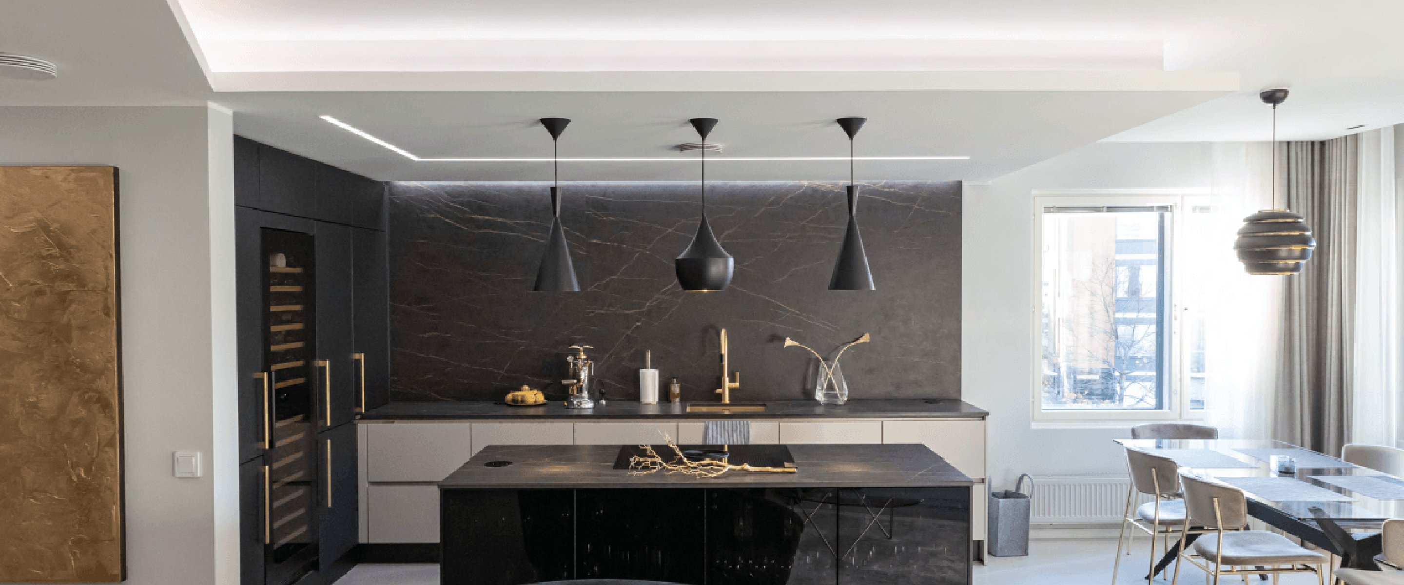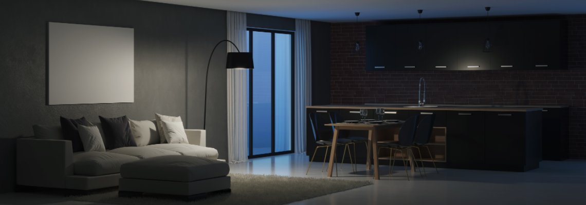 Adequate lighting efficiency depends on how the space is used. For example, the amount of light needed in the living room is less than in the kitchen because of the different uses. The amount of light needed on a kitchen worktop should be at least 500 lux. When choosing lighting, you should also take into account the height of the room and the colour of the materials: the higher and darker the room, the more efficient the lighting.